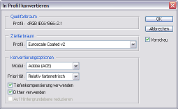The colour space conversion via ICC-profile is built into many computer programs (e.g. Adobe, CS, Corel GS). Since its 1998 inception it has become the virtual standard for the conversion of colour spaces.