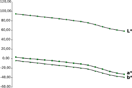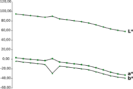 Outliers stem from print inaccuracies, dust particles or measurement mistakes. In the framework of revision L*a*b*-measurement values were defined as outliers if their L*, a* or b* deviated from the mean value of their neighboring value by more than two units.